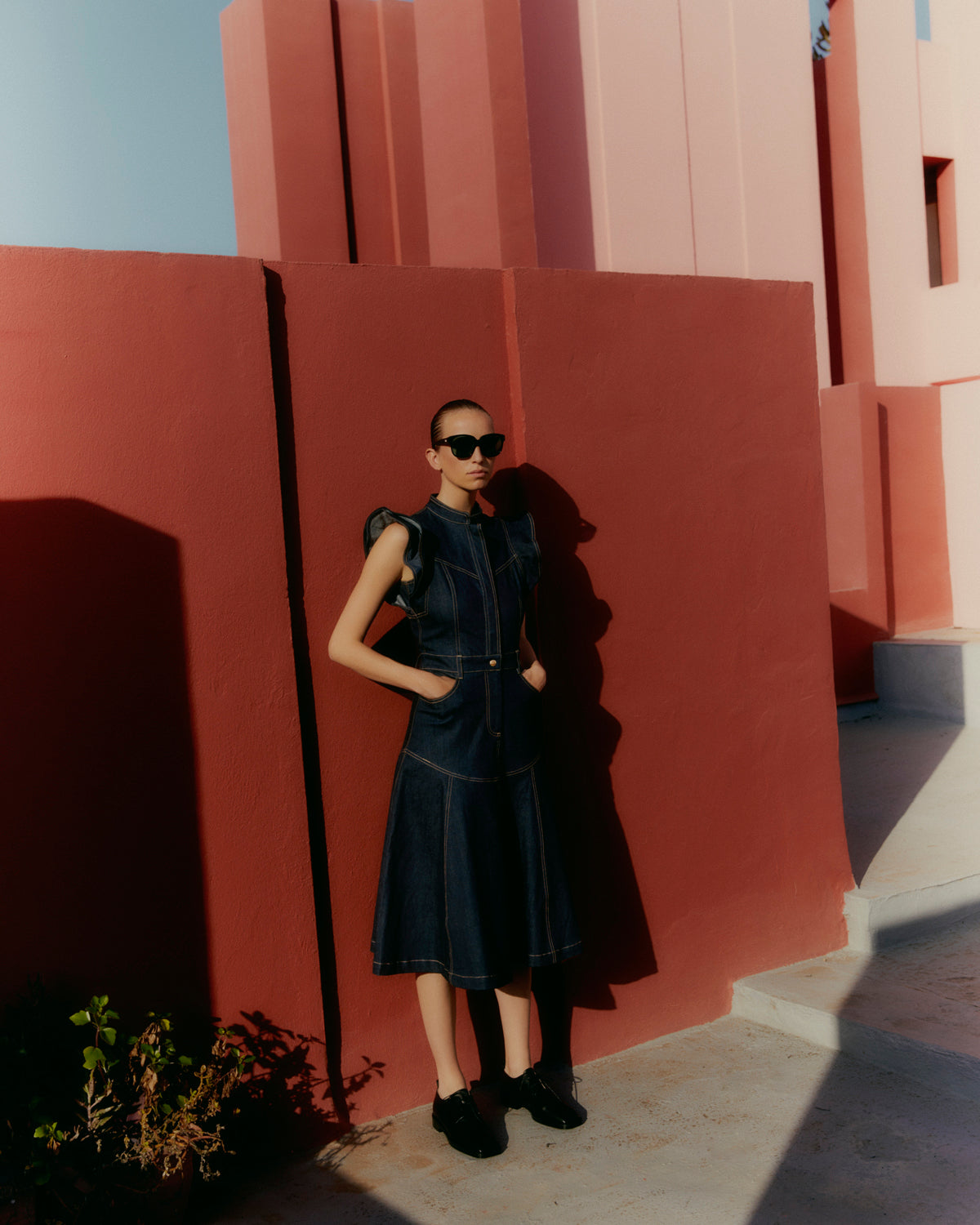 The colour palette brings together numerous shades of blue - inspired by Kahlo’s famous Casa Azul home in Mexico City - and mixes them with the rose pinks, oranges and berry reds of the desert that surrounded O’Keefe’s Sante Fe ranch. They are in turn set against a base of neutrals, black and pure white. Fabrics include a soft, relaxed linen, crisp cotton, signature silk and, for the first time, a raw denim. The latter is used both in work-wear such as a jumpsuit and trousers but also in more surprising pieces like a puff-sleeve blouse with brass buttons - the perfect mix of utility and femininity. Duality is also explored by combining fabrics - a jersey t-shirt has poplin cotton ruffled sleeves and a linen blouse has lace crochet inserts and buttons.