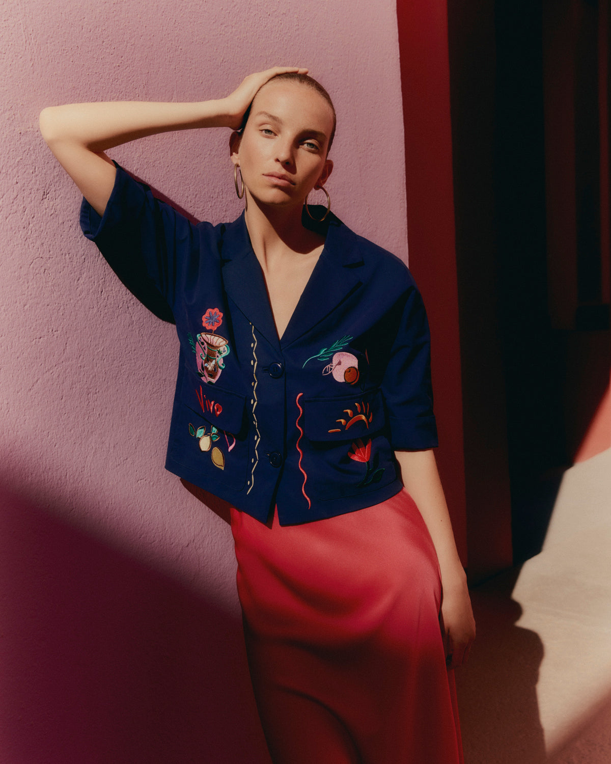 Silhouettes are sitting closer to the body this season. Dresses have deep waistbands and attached belts to draw the shape into the waist whilst other looser shapes have rope belts with wooden beads to serve the same purpose. Many have much shorter hems that stop above the knee for a fresh and youthful attitude. Tailoring follows the same body skimming lines with a more nipped in waist on a blazer with piping as an added detail. Trousers have cargo details and a longer length skirt has buttons running down the front. A striking trench coat in black has exaggerated sleeves whilst a more classic version looks chic in pale rose pink. Knitwear is gossamer thin in shocking pink tops with dramatic sleeves and ruffle details or heavier weight as a cardigan embroidered in a swirly DK logo. And for the ultimate tribute to two extraordinary women, there is the Dea Kudibal version of O’Keefe’s iconic white shirt - this one with buttons along the entire sleeve - and Kahlo’s workwear jacket, rendered exquisite with folkloric embroidery.