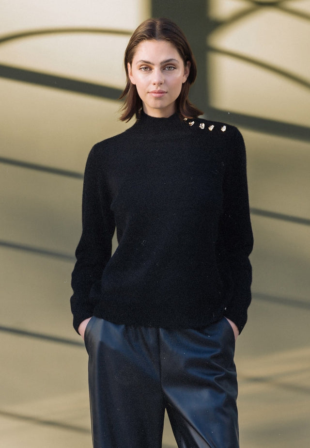 Nothing beats the luxurious feel of pure cashmere next to the skin and this jet black sweater feels as good as it looks. Easy fitting, it has a turtle neck with decorative brass buttons at the shoulder. The hem and sleeves are finished with a deep rib.