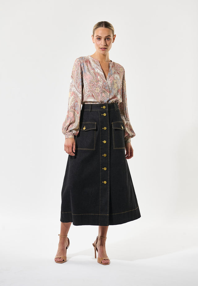 Elegant and wearable, this regular fit viscose crepe blouse in a beautiful pink paisley design has a small band collar and cross over placket at the front. Voluminous sleeves are pleated into small covered button cuffs and there is a slit at the side seam.