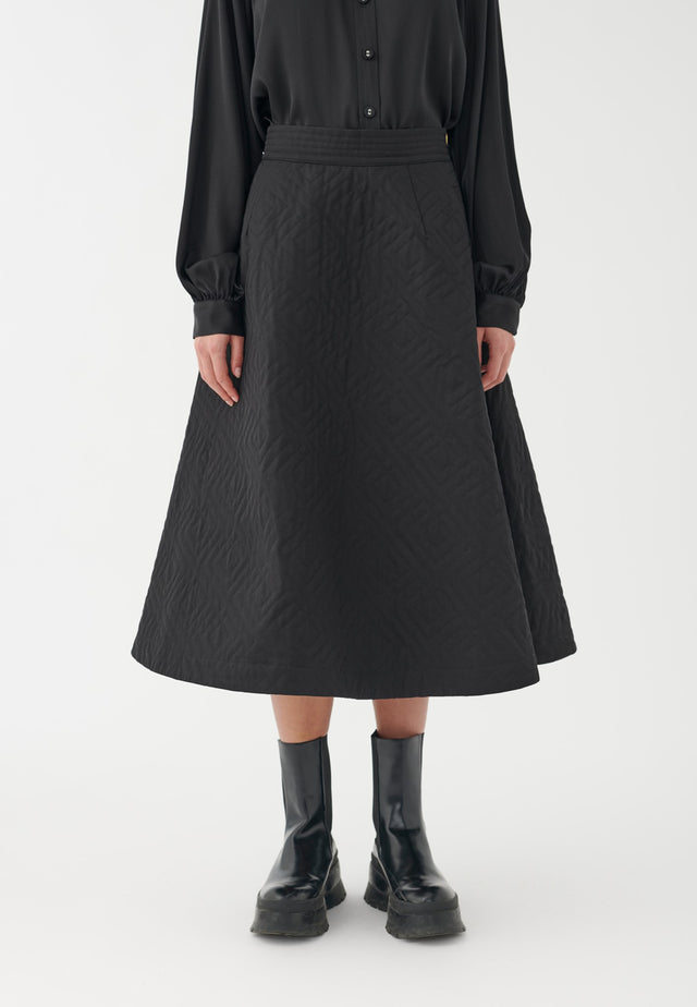Elegant and chic, this flared black skirt skims the hips before falling to below the knee. The cotton blend fabric has a sheen that makes it perfect for evening.