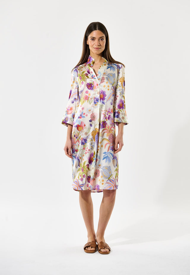 Definitely one of Dea Kudibal’s most popular styles, this relaxed fit mid-calf length dress is perfect for summer. The kimono neckline and collar give it a sophisticated elegance whilst the deep sleeves have a laid back air. This chic version comes in a delicate floral print on silk.