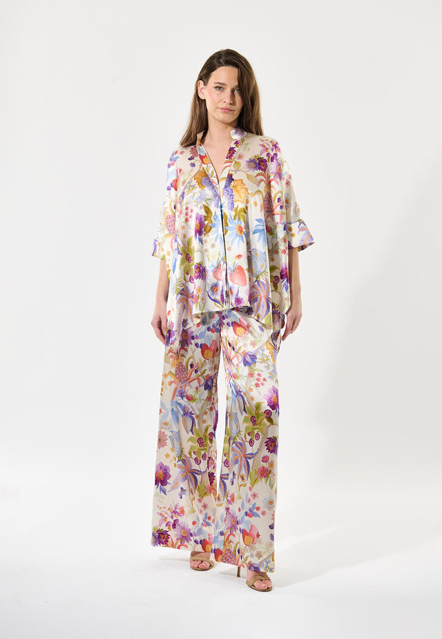 Oversized and easy to wear, this very wide cut blouse in a beautiful floral print silk has 3/4 length sleeves, a hidden button front and a small stand collar. Wear with jeans for a casual day look or dress it up with a skirt for evening.
