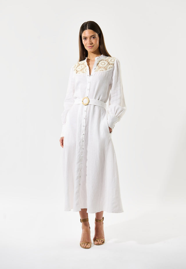 Adding an extra romantic layer to this mid-calf length dress in natural white premium linen are the inset panels of delicate lace at the front and back yoke, edged with lace tape. Covered buttons lead down from a round collar whilst full sleeves are gathered into deep narrow cuffs. The regular fit dress can be pulled into the waist by the raffia buckled belt and it comes with a slip dress to be worn underneath.