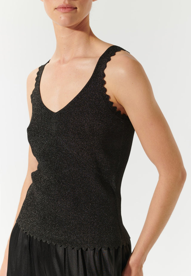 A delicate scalloped edge gives this deep brown jersey top a delightful, feminine touch. Two different scales of rib define the body creating a close fit shape that works as a layering piece or as a top on its own. A hint of lurex running through the fabric adds an element of luxury.
