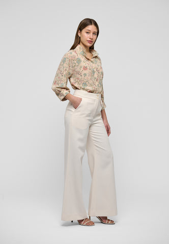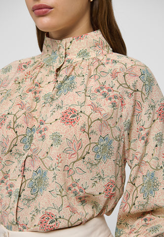 With its print of soft coloured flowers, this silk shirt is relaxed and yet still elegant. The body gathers with tiny tucks at the front and back into a high stand collar with multi-stitching and it has 3/4 length full sleeves