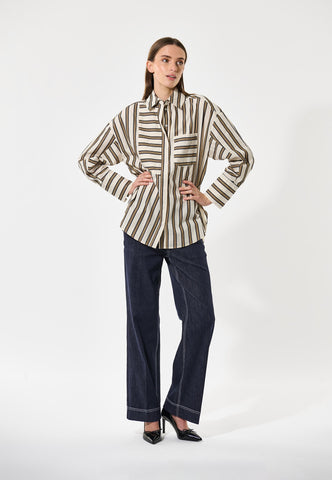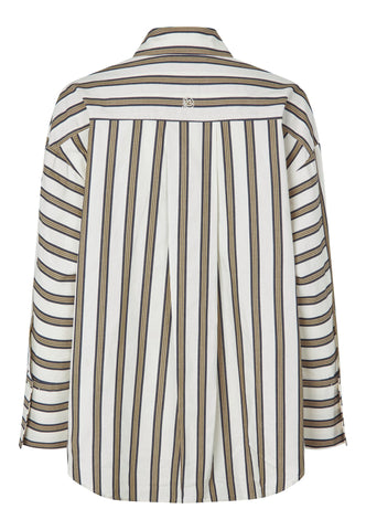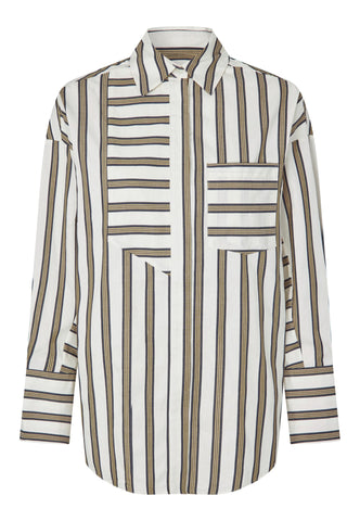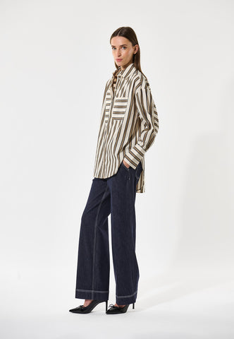 Oversized and relaxed in attitude, this easy fit cotton shirt in bold stripes has a classic collar and deep cuffs. A half bib panel, breast pocket and back sleeve are all cut horizontally to give a graphic twist to the shirt. It fastens down the front with a fly that hides the buttons.