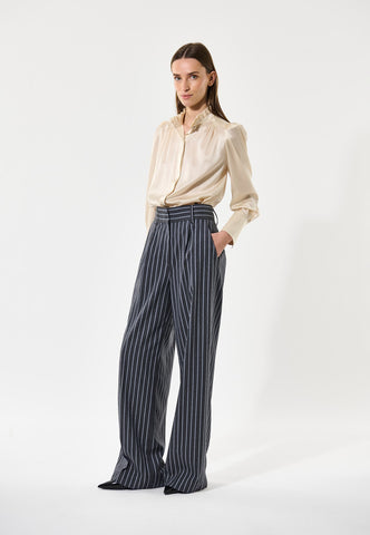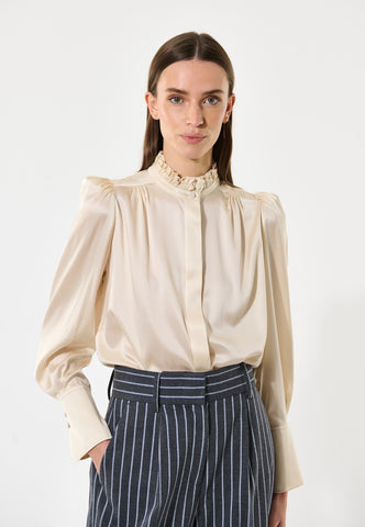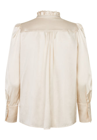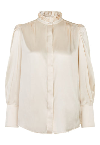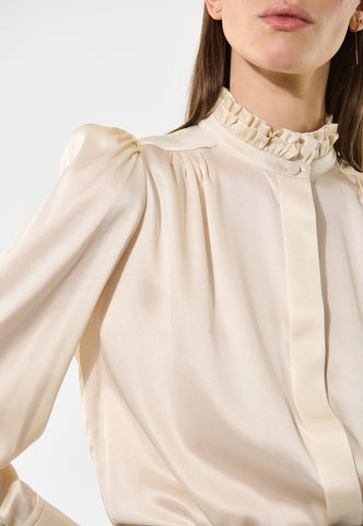 This sophisticated and elegant blouse has two frills making a stand collar and concealed buttons down the front. Small tucks appear at front and back at the neckline and it is in a chic cream silk twill.