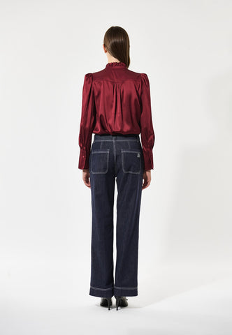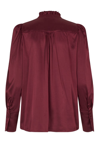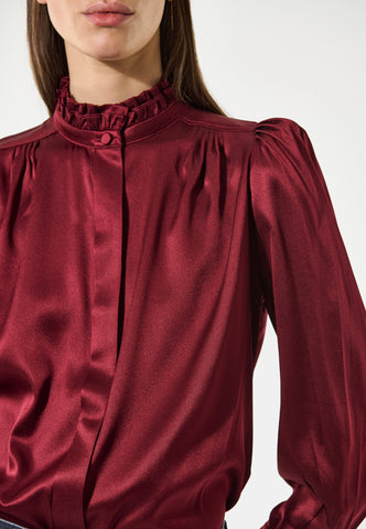 In rich burgundy silk twill, this fly front blouse has a high collar made from two rows of ruffles and shoulders accentuated by gathers and small shoulder pads. Tucks at the back give a little ease and comfort.