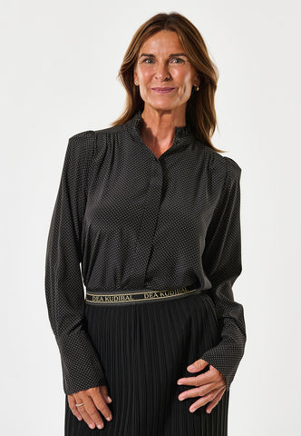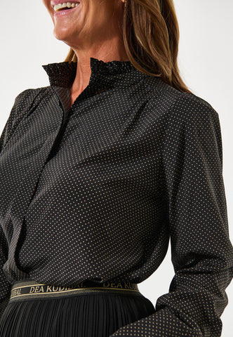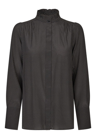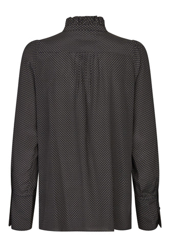 This chic and stylish blouse has two frills making a stand collar and concealed buttons down the front. Small tucks appear at front and back at the neckline and it is made in a sophisticated black silk with tiny white pin dots.