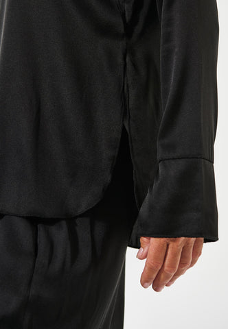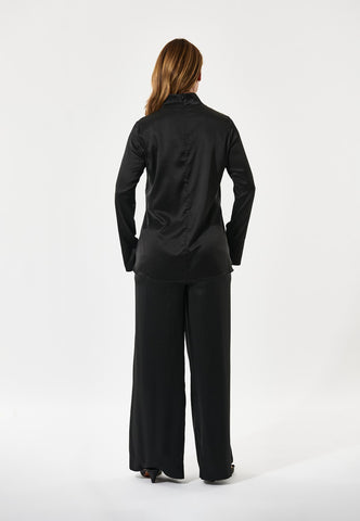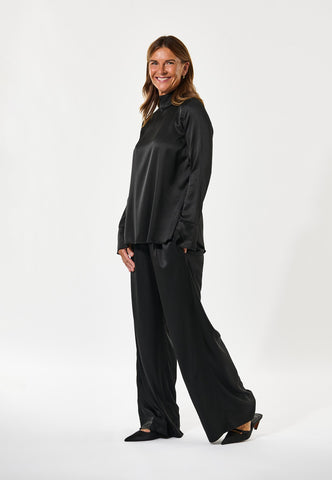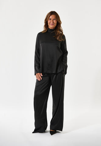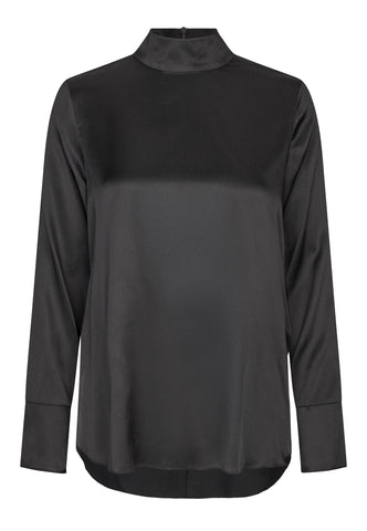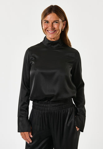 Totally minimalist and utterly chic, this jet black silk twill high neck top with long sleeves works as a beautiful contrast to a patterned skirt or trousers or as a sophisticated layering piece under a blazer. Body skimming in silhouette, it is fastened by a hidden zip at the back neck.