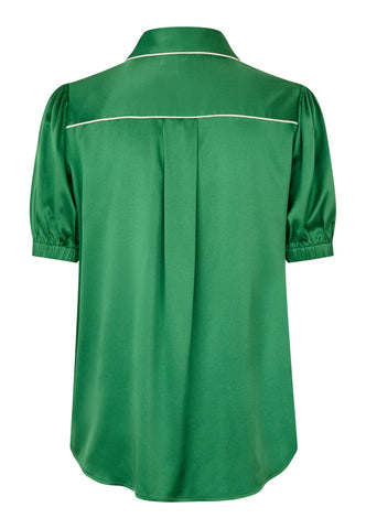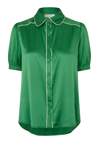 A short sleeved shirt in silk is a great addition to a summer wardrobe. This version has a classic collar and an easy fit and comes in a stylish green with contrast white piping details.