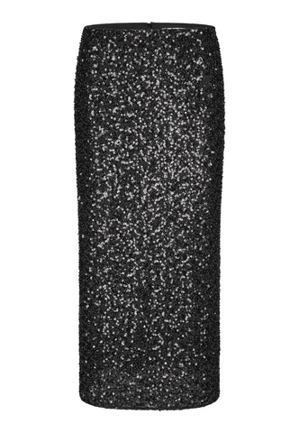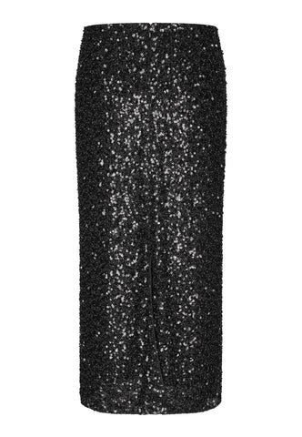 A perfect example of understated luxury, this slim fit tube skirt is entirely encrusted in black sequins. Fastened at the back with an invisible zip, it can be worn with a knit or simple shirt or t-shirt or perhaps, for more high octane glamour, with the matching Anine top.