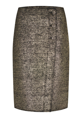 Slim, elegant and very sophisticated, this skirt in a luxurious gold bouclé fabric fits close to the hips and falls to below the knee. An asymmetric opening at the front is closed by three embroidered buttons. Wear with a simple shirt or knit or make a stylish suit with the matching Safa jacket.