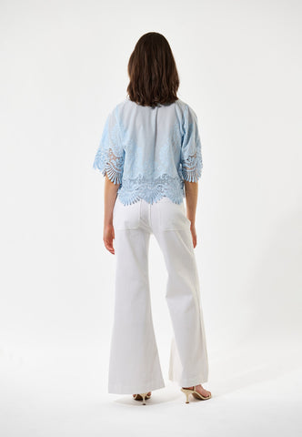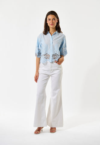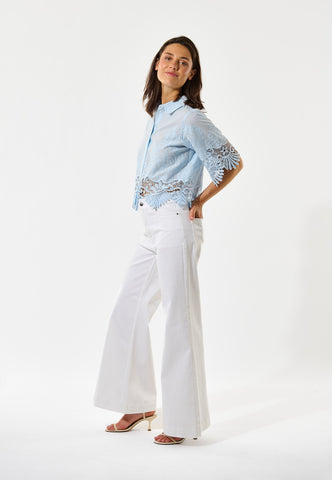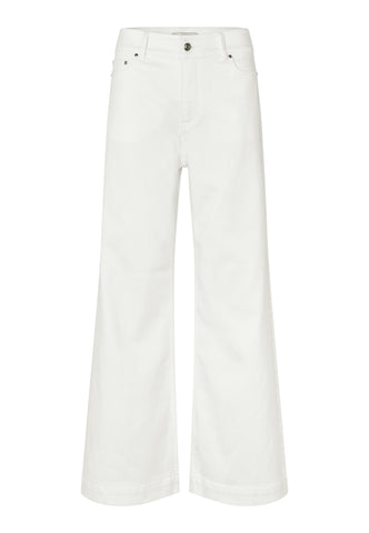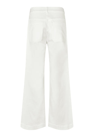 Fitting close to the hips and high on the waist before flaring out to the hem, these white denim pants are a stylish and versatile addition to the wardrobe. Western jeans style front and back pockets add an urban attitude. The trousers can be worn alone or matched with the Blanca jacket.