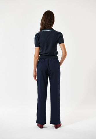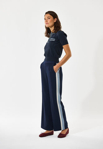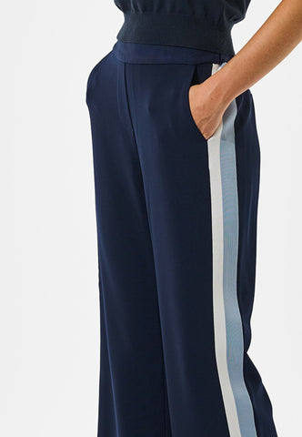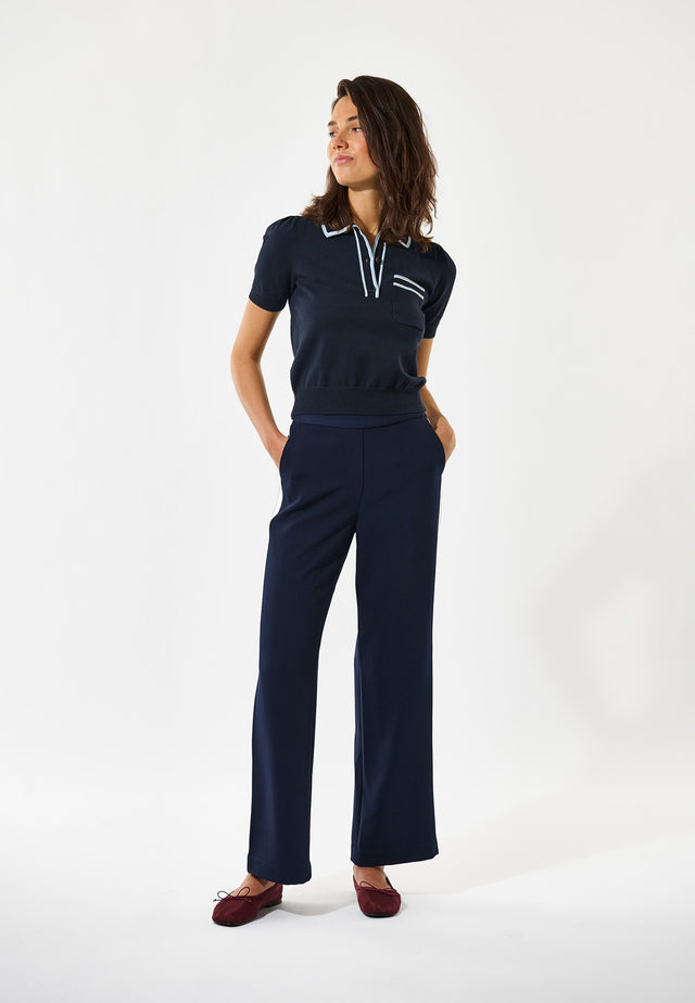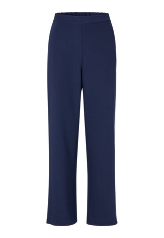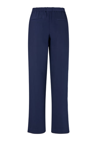 Easy to wear but stylish and elegant these straight leg pull-on trousers have a loose fit which makes them perfect for both day and evening. Made from a stretch fabric in deep navy blue, they have an elasticated waistband at the back and two rear welt pockets.