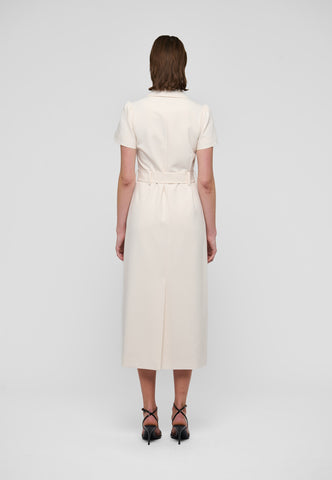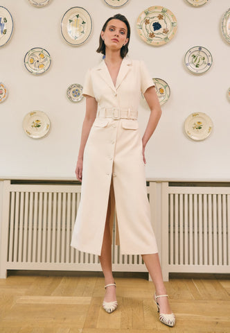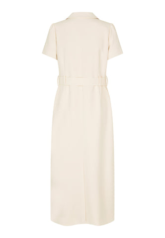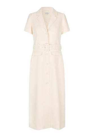 With its cool retro vibe, this short sleeved shirt dress in a cream viscose blend crepe fabric is chic and stylish. It has a regular revere collar, two flap pockets and buttons up the front. A wide belt with a fabric covered buckle defines the waist.