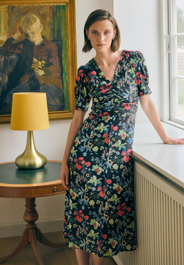 Small pleats at the waist are used to create a chic fitted silhouette on this V-necked silk dress that falls to mid calf. The joyful print of bright flowers on a black background add an extra feminine appeal as do the short full sleeves that are held closed with self fabric tapes.