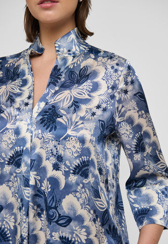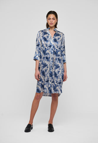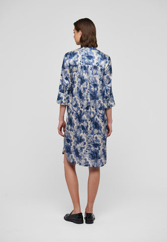 One of Dea Kudibal’s most beloved and enduring styles, this easy fit mid-calf length dress is perfect for all body shapes. The kimono neckline and collar give it an elegance whilst the deep sleeves with cover buttons have a relaxed air. This stylish version comes in silk with blue printed exotic flowers.