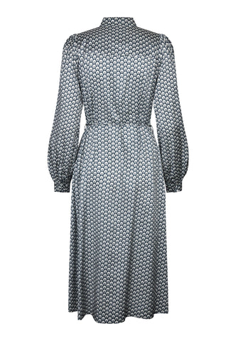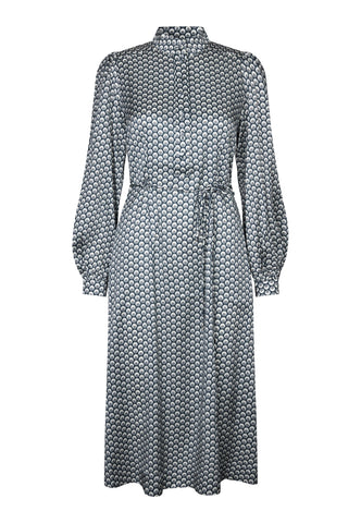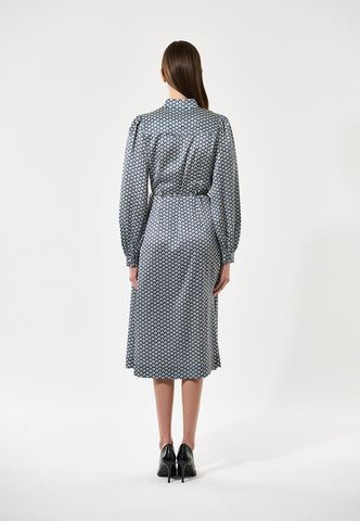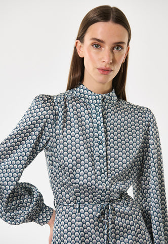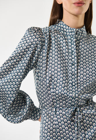 Fitted at the body and then flaring out to an A-line mid calf length skirt, this dress in silk printed with a graphic, optical design is flattering and chic. It has a stand collar, full sleeves that end with a buttoned cuff and a self fabric belt finished with metal ends. The dress is fastened with a hidden side zip and a front placket with covered buttons.