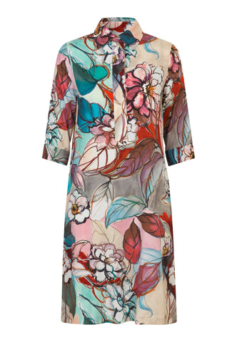 The simplicity of a collared shirt dress is the perfect vehicle to highlight a beautiful fabric, in this case a bold oversized floral print on silk. Three-quarter sleeves and a hidden placket keep things clean-cut on this mid calf length dress whilst a flower button at the neck is a delightful finishing touch.