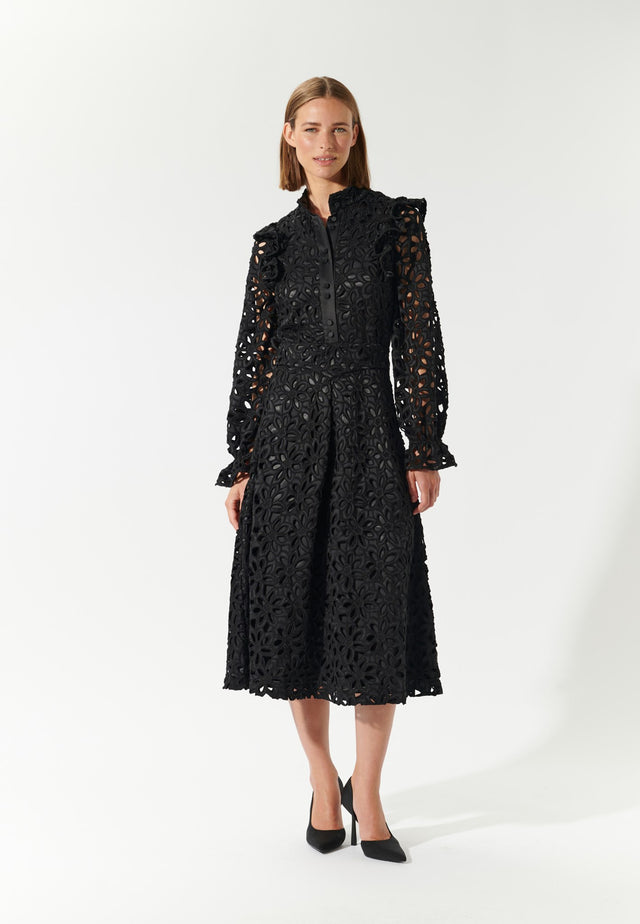 A little black dress is a must in any wardrobe but this version is particularly romantic. Made from oversized black broderie-anglais, it is fitted over the bodice and waist panel before flaring out into a mid-calf length skirt. There are delicate ruffles at the stand collar and shoulders and the sleeves gather into elasticated cuffs. The body of the dress is fully lined in stretch satin.
