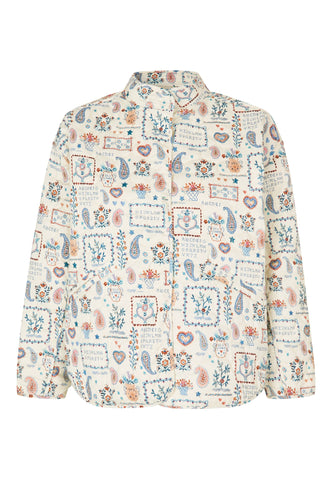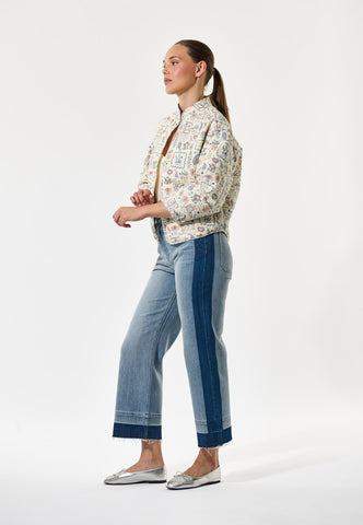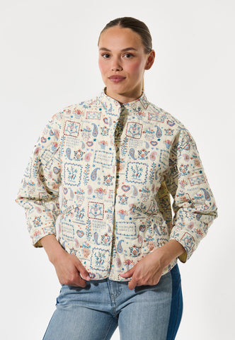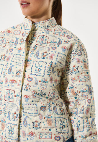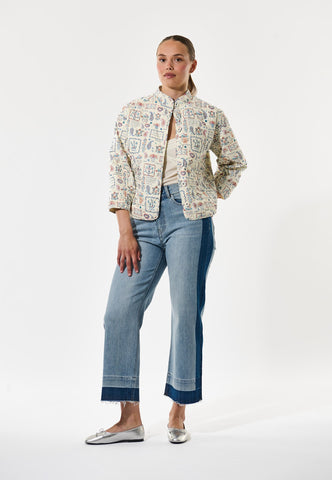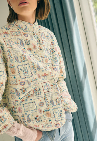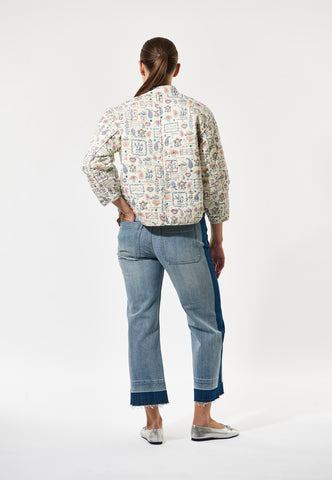 Cosy but very chic, this quilted cotton jacket is perfect for those chilly spring days. Decorated with a charming print of embroidered patches and motifs, the jacket has a stand collar with multi stitching, binding around the edges and two jet pockets at the front. It is cropped in length, has 3/4 sleeves and closes with covered snap buttons.