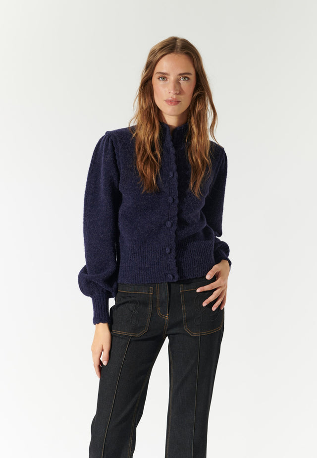 The scalloped edge that runs around this navy blue cardigan adds an unusual and feminine touch whilst the high collar and full sleeves create a strong silhouette.