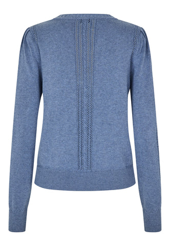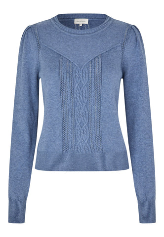 Delicate cabling and lace stitching run down the body and sleeves of this round neck sweater whilst a seam accentuates the bust line. Knitted in a cotton/wool blend in blue melange, the sweater has more lace knit and gathers around the shoulders.