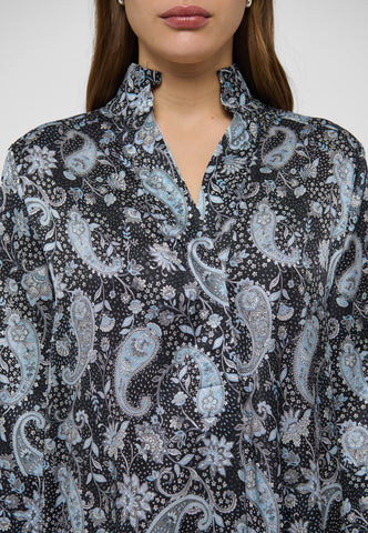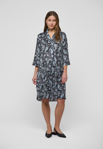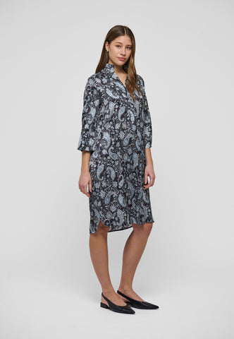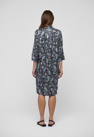 Truly one of Dea Kudibal’s most popular and timeless styles, this easy fit mid-calf length dress is perfect for all body shapes. The kimono neckline and collar give it an elegance whilst the deep sleeves with cover buttons have a relaxed air. This beautiful version is in black silk printed with an allover design of blue paisleys.