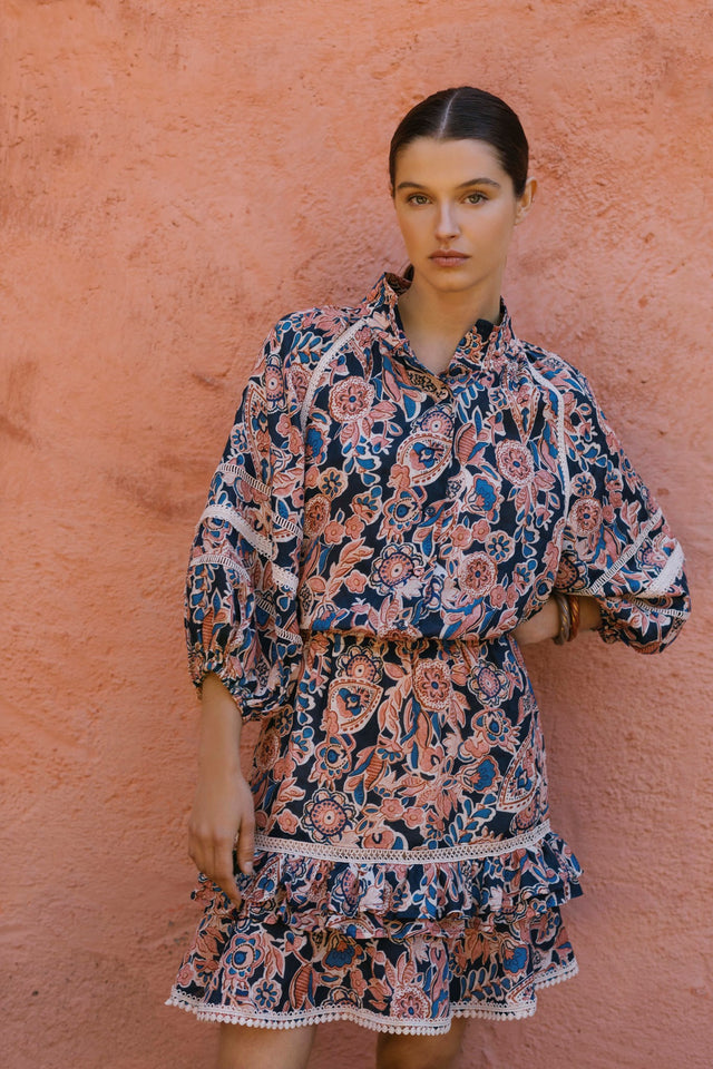 Fresh and feminine, this short relaxed fit dress has a carefree attitude with its ruffled skirt and volume sleeves. Lace tape inserts on the shoulders, sleeves and flounces bring an extra detail to the floral printed linen whilst a stand collar with buttons keeps things demure.