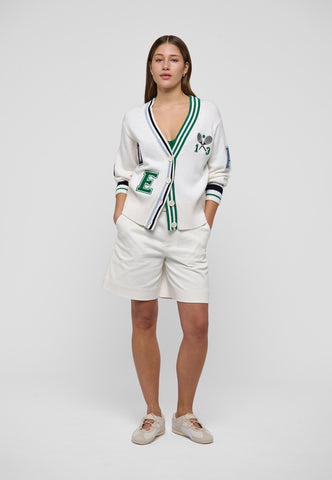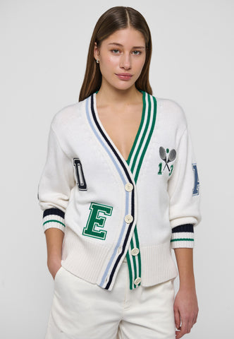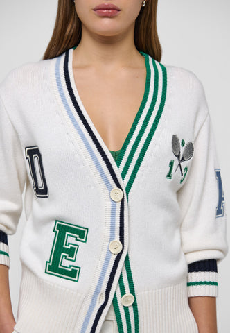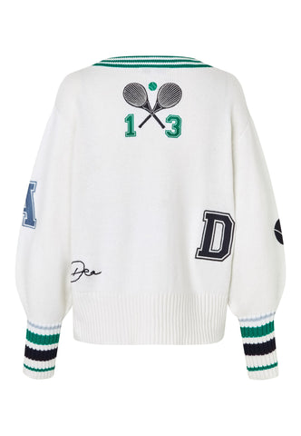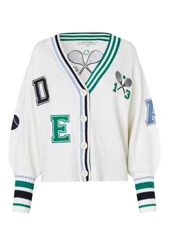 Sporty yet chic, this cardigan is a fun addition to any summer outfit. Knitted from white viscose cashmere blend yarn, it has varsity-style embroidered letters and tennis club motif to the chest and centre back. Contrast stripes run around the neck and cuffs as a graphic detailing.