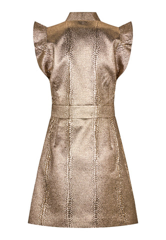 Creating a dramatic silhouette, frilled cap sleeves and a stand collar make a bold statement in this short cocktail dress. Made from a gold fabric, it is tight fitted across the bodice before flaring out into a bell shaped skirt. A deep v neck adds to its allure.