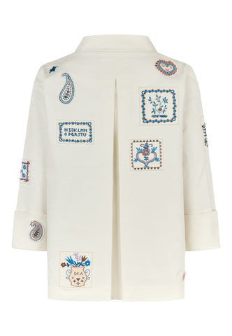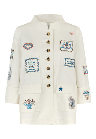 Creative and charming, this cotton jacket is covered in small embroidered patches that evoke an artistic and handcrafted style. The straight cut jacket has a stand collar, flap pockets and buttons up the front. A deep pleat at the back gives ease of movement and adds to its relaxed vibe.