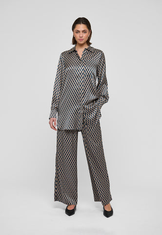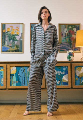 Wide leg pants in silk are a favourite summer style and this pair in a small latticework graphic print with a wide elastic waistband are a chic example. Wear with a simple top or a knit for an effortlessly elegant outfit.