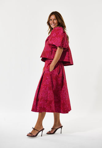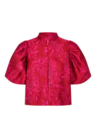Creating a bold, sculptural silhouette, this jacket is a perfect choice for evening. With large balloon sleeves and a high collar, it is fastened at the neck with a hook and eye and has hidden pockets in the side seams. This beautiful version is in rose pink jacquard fabric.