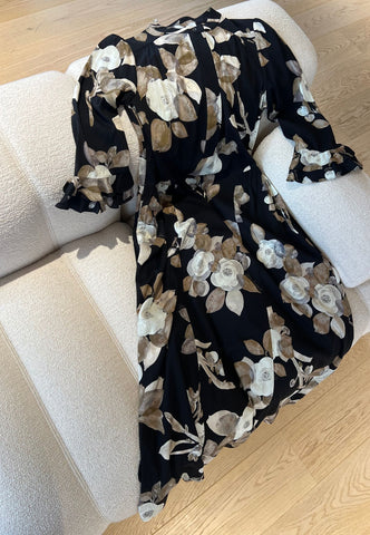 Feminine and easy to wear, this mid length viscose crepe dress in a beautiful print of camellias on a dark background is loose fitting with a round neckline, placket front and ruffled cuffs. The side pockets add to its relaxed sense of ease.