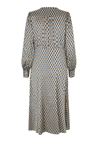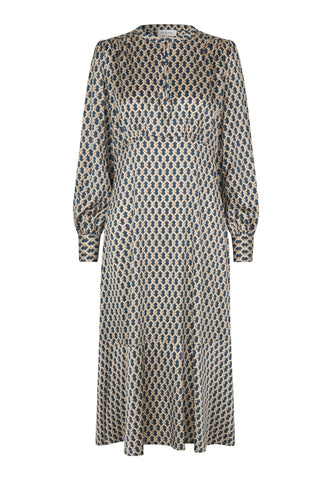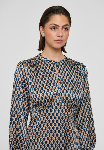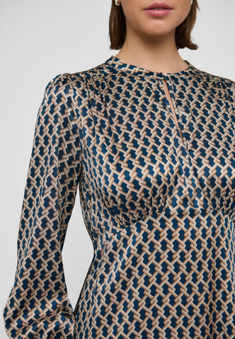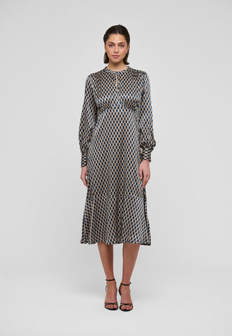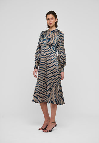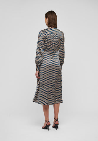 A key hole front fastened with a small covered button and loop is a stylish feature to this silk twill dress in a sophisticated graphic print. The dress is in an easy fit that flares out to fall mid-calf.