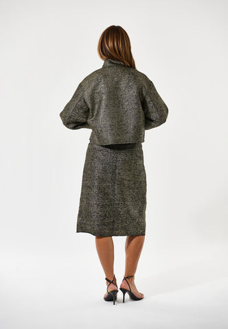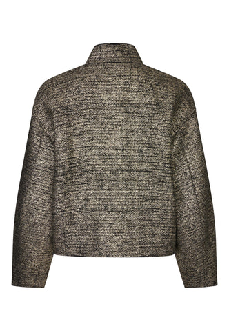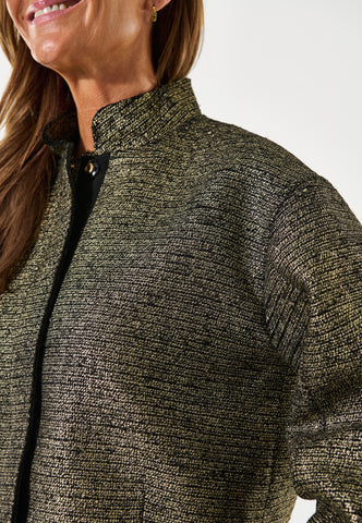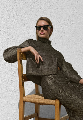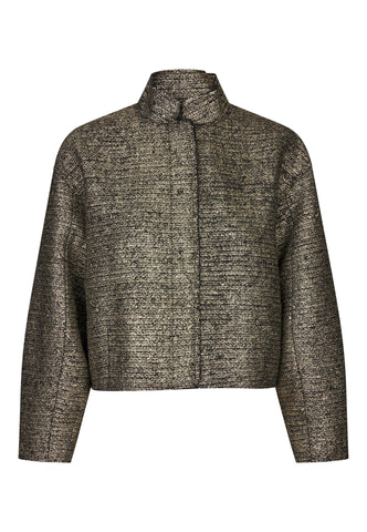 Minimal details on this beautiful jacket allow the stunning gold bouclé fabric make the real statement. Closed with a fly front and snap stud fastenings, the jacket has a stand collar, sculptural sleeves and is cropped to finish at the waist. To make a truly glamorous outfit, pair with matching Gigi skirt.