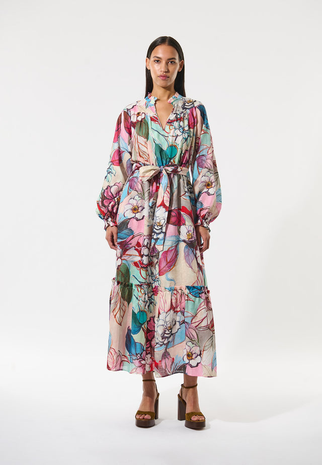 The very epitome of feminine dressing, this regular fit full length dress with balloon sleeves and a flared, flounced skirt is pulled into shape at the waist with a self fabric tie belt. Adding to its springtime allure, the fabric is a fine linen in an oversized floral print.
