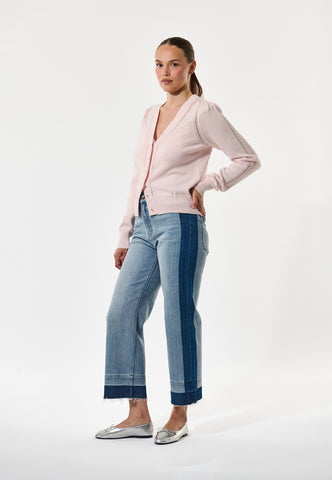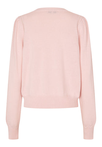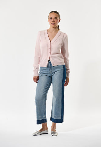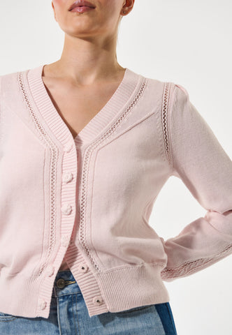 Delicate rows of lace stitch run down the front and around the shoulder seams of this cotton/wool blend cardigan in pale pink. Knit covered flower buttons are a delightful finishing touch. Wear with jeans during the day or over a silk dress in the evening.