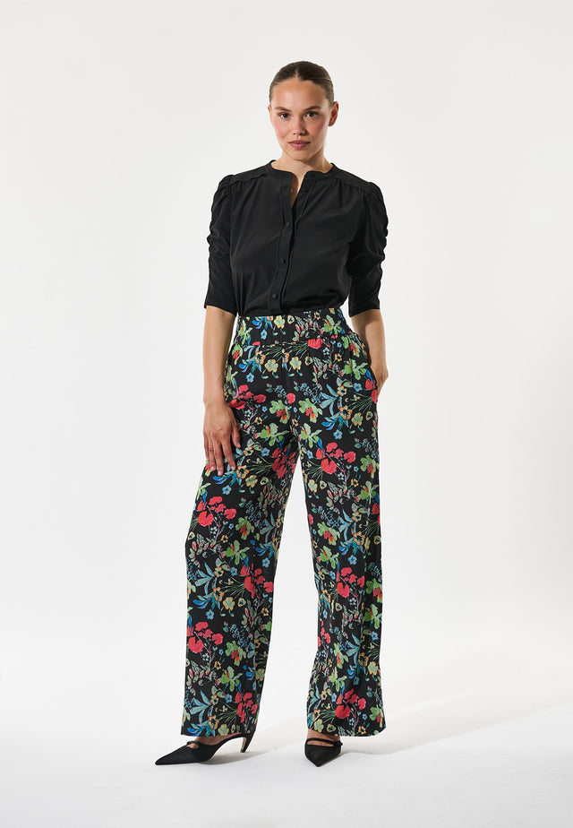 Wide leg pants in silk are a classic summer style and this pair in a bold floral print with a wide elastic waistband are a beautiful example. Wear with a simple top or a knit for an effortlessly chic outfit.