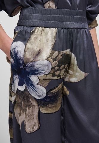 Wide leg pants in silk are a timeless summer style and this pair with a bold oversized flower print and a wide elastic waistband are a beautiful example. Wear with a simple top or a knit for a relaxed and stylish outfit.