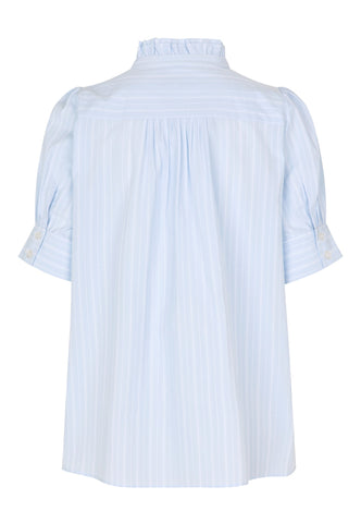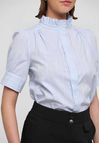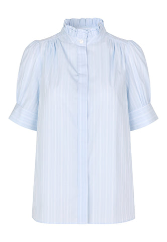 This sophisticated and elegant short sleeved blouse in pale blue striped poplin has two frills creating a stand collar and concealed buttons down the front. Small tucks appear at the front and back neck and there are detachable self fabric shoulder pads.