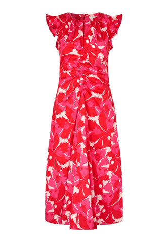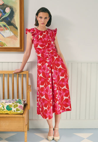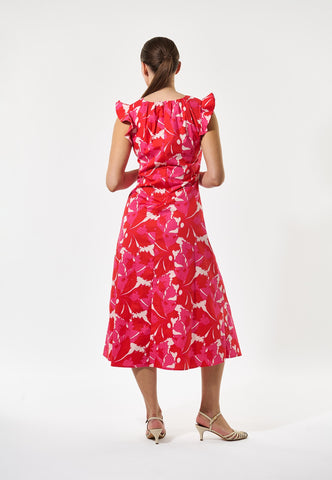 Large frills at the shoulders give this beautiful cotton poplin dress a striking silhouette as they give way to a fitted bodice with gathers at the neck and a skirt that falls to mid calf. Gathering also creates shaping down the front and a keyhole opening with single button is an elegant detail. The bold print of red and pink leaves adds a bit more drama into the mix.