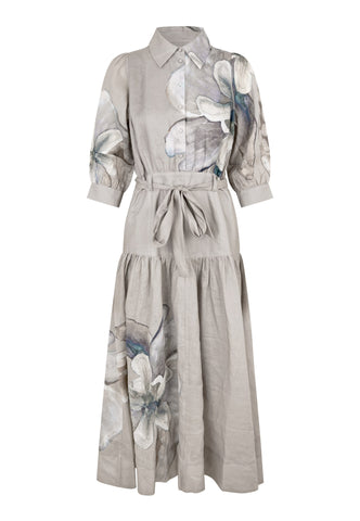Beautiful oversized painted flowers in natural shades are scattered over this full length printed linen dress. A fitted top with neat shirt collar and half placket with 3/4 length sleeves opens into a wider skirt below a waist which is defined by a self fabric tie belt. The dress fastens by a zip at the side.