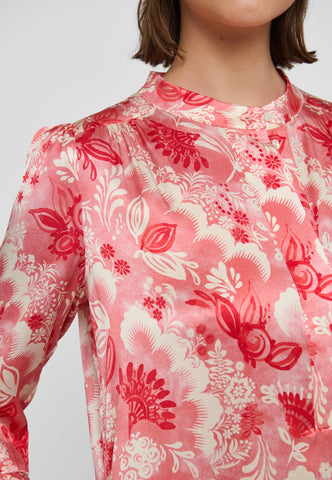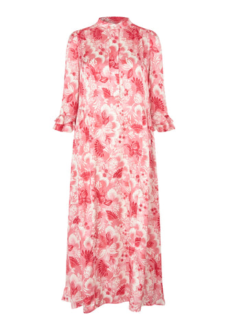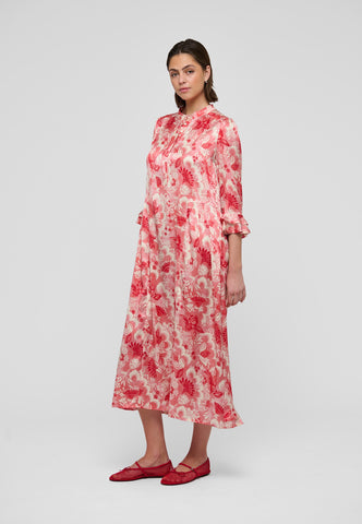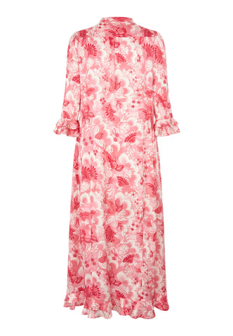 A bold red floral print on silk twill gives this ankle-length dress with 3/4 sleeves a real presence - it is both striking and very chic. There are double ruffles on the cuffs and at the back hem and gathering on the sleeves.
