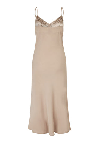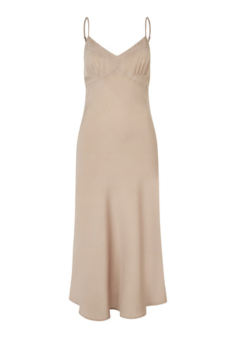 A slip dress in silk is a stylish and sensuous option for evening, worn under a blazer or soft cardigan. This pale beige version features multiple, intricate panels and tucks at the bust to create the perfect shape. It is suspended from two adjustable spaghetti straps and the bias cut means that it skims the body and falls gently to mid calf.