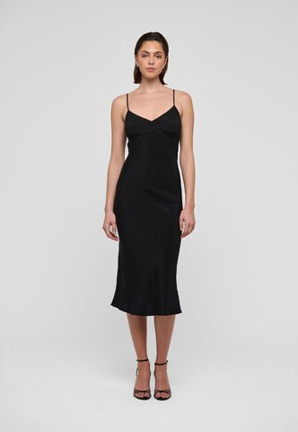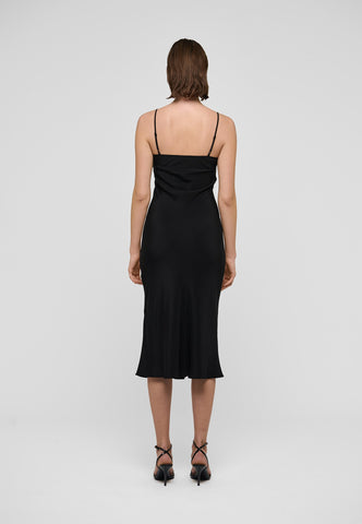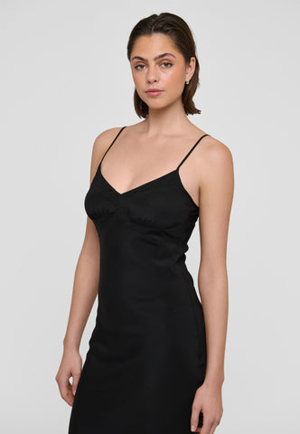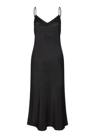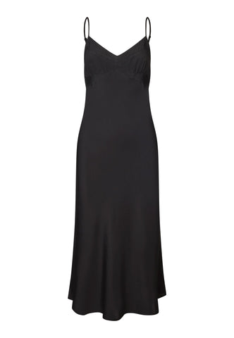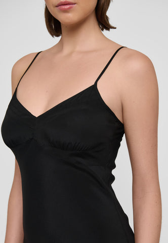 A slip dress in black silk is a chic and sensuous option for evening, worn under a jacket or soft cardigan. This stylish version features multiple, intricate panels and tucks at the bust to create the perfect fit. It is suspended from two adjustable spaghetti straps and the bias cut means that it skims the body and falls gently to mid calf.