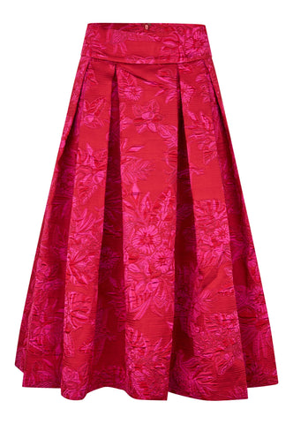 Deep box pleats gather into a wide waistband before flaring out in this full skirt that falls to mid calf. Made in luxurious red floral jacquard, it is perfect for evening paired with a simple shirt or fine knit.